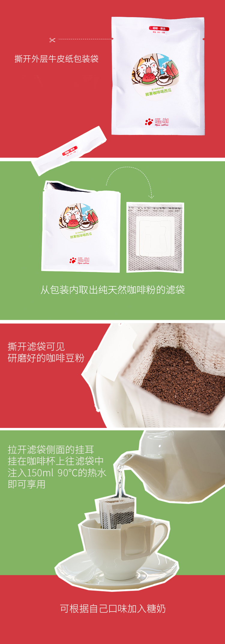 「喵咖啡」形态为旅行挂耳包,也就是把百分百纯咖啡粉封装在小型滤袋里。可以像泡茶那样轻松制作出一杯美式,再根据你的口味选择加糖加奶。90 度的水温,用 150 毫升冲泡一袋咖啡,将得到最佳体验。香味,只有香味,才能让你脱离速溶,投入现磨咖啡的怀抱。