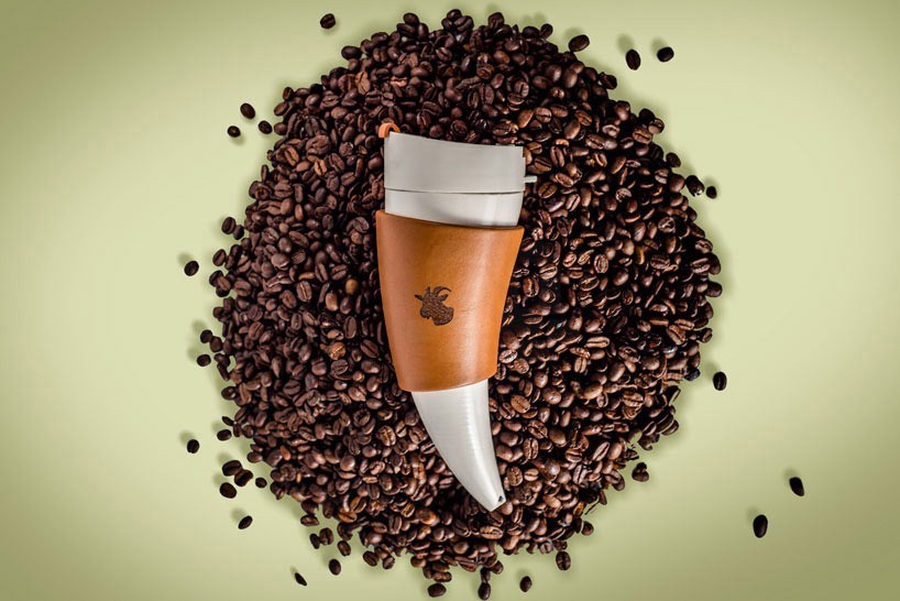 咖啡杯 Goat,顾名思义是以山羊为原型,向山羊致敬。杯子的造型就是一个山羊角,这个形状有利于使用者把最后一滴咖啡都喝光。而且皮革杯套是防水,取下后可以作杯子的底座,能够将被子安稳地放在桌面上。杯子配备了带子,使用者可以把咖啡杯悬挂在背包上,随时携带。