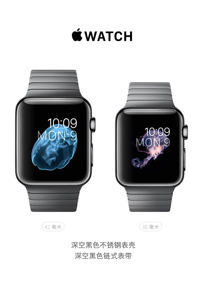 使用不锈钢,显示屏蓝宝石玻璃,可搭配苹果提供的 6 款表带(链式表带、米兰尼斯表带、现代风扣式表带、经典扣式表带、运动型表带、皮制回环形表带)根据不锈钢颜色和表带材质、颜色的不同,价格在 4188 ~ 8288 元间浮动。 - Apple Watch Edition 共有 8 个款式