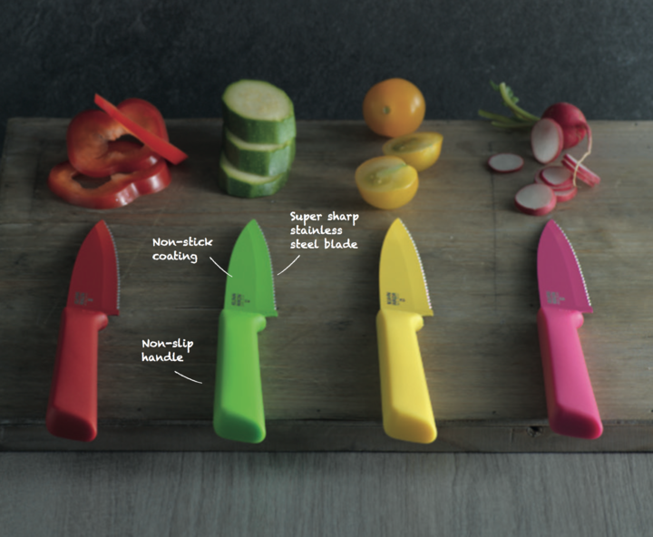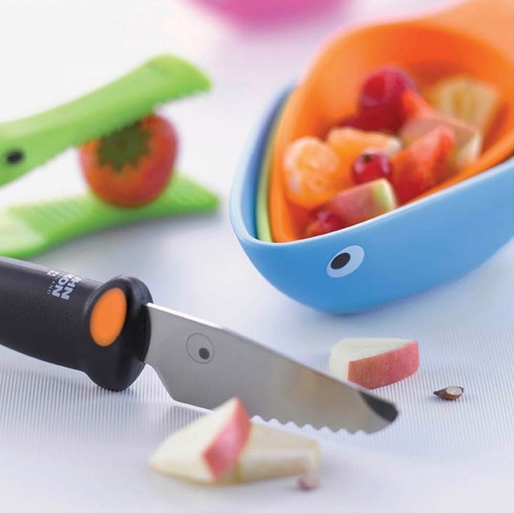 万用刀采用的是坚硬的日本不锈钢,保证了刀刃的锋利与持久;锯齿刀用于切面包与水果;削皮刀则能精准切割果皮。