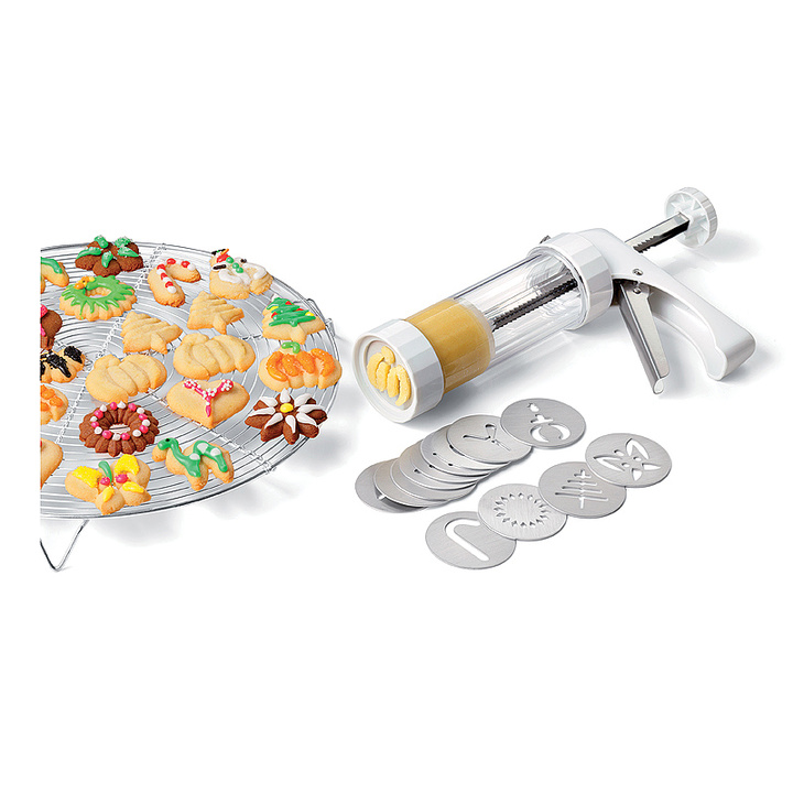 产品附送了 14 个不同形状的碟片和多种食谱,你可以在几分钟内,用曲奇枪制作出美味有趣的饼干。