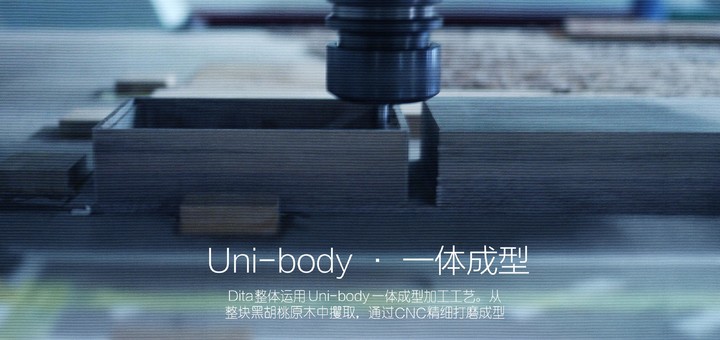 Dita 由一块完整的优质北美黑胡桃木加工而成,由于材质的特殊性,外壳原型需要一名老匠费时数天雕琢,再由 CNC 精细打磨,从拿上手的那一刻起,就能感受到这款产品手感坚固和温润,跟普通的「电子产品」有本质上的区别。重点是,每一块黑胡桃木的纹路均不相同,每一个出厂的 Dita 可以说都是独一无二。