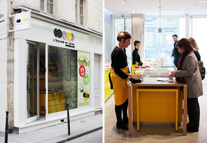 位于法国巴黎玛黑区 Saint-Paul 站附近的 L’Éclair de Génie,是法国最著名的闪电泡芙专卖店之一,黑色、灰色、黄色搭配的 logo 醒目又简约,店内装潢也走简洁路线。