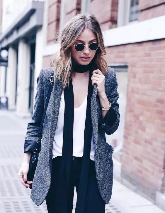 黑色窄丝巾搭配白衬衫或浅色衬衫都能很好增加衣服的色彩跳跃度。