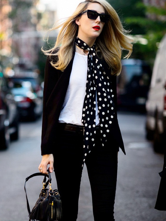 波点窄丝巾配白衬衫,最配刚毕业的你。白衬衫的素净和职场感也许你 Hold 不住,但波点的小可爱气质让你的少女感「侧漏」,复古又俏皮。