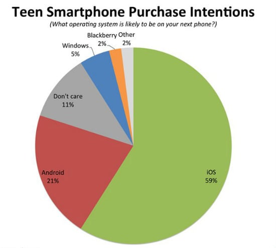 Business Insider Intelligence 调查显示,59% 的美国青少年希望下一部智能手机是 iOS 系统,仅有 21% 期待 Android 手机。 不过,调查人员指出,鉴于青少年没有收入来源,最终他们拿到手的往往是便宜的 Android 手机。