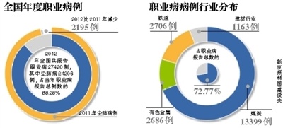 国家卫生计生委发布:2012 年,全国共报告职业病 27420 例,其中尘肺病 24206 例,占当年职业病报告总例数的 88.28%。 从行业分布看,煤炭、有色金属、铁道和建材行业的职业病病例数较多,分别为 13399 例、2686 例、2706 例和 1163 例,共占报告总数的 72.77%。