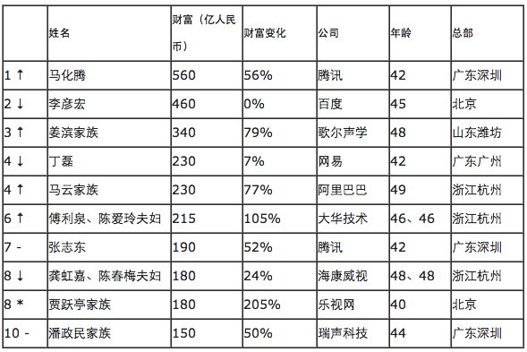 《2013 胡润 IT 富豪榜》9 月 23 日在上海正式发布。42 岁的马化腾以 560 亿财富新高 4 年来第一次超过李彦宏,成为 IT 新首富;李彦宏以 460 亿元位居第二;“黑马”49 岁的歌尔声学姜滨家族通过两年 2.7 倍的发展,第一次进入前三名。