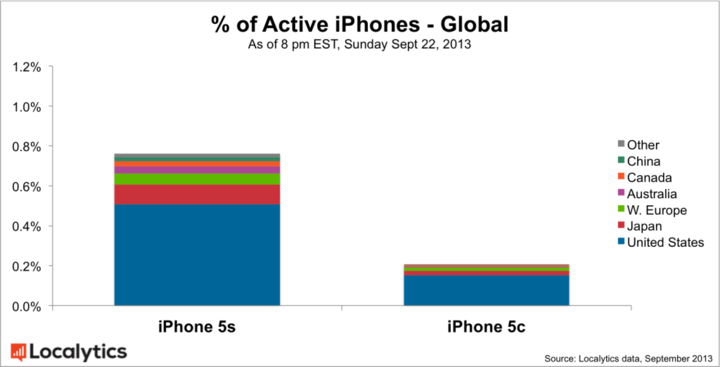 iPhone 5s 和 iPhone 5c 占美国市场所有已激活 iPhone 的 1.36%,这一数字来自美国四大运营商的 iPhone 激活情况。 而放眼全球市场,iPhone 5s 激活量依然远超 iPhone 5c,前者是后者的 3.7 倍。