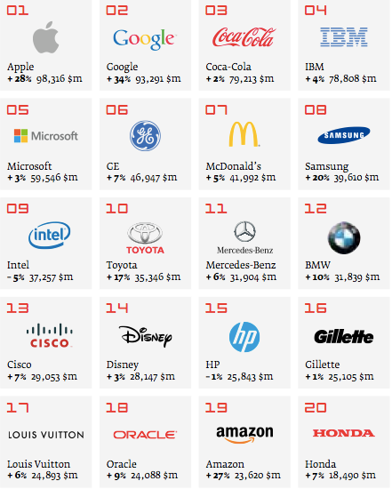 品牌顾问公司 Interbrand 发布的最新报告显示,苹果超过可口可乐,成为今年全球最具价值的品牌。Interbrand 估计,苹果品牌价值为 983 亿美元,较 2012 年上升 28%。 前 10 大品牌中,有 5 家是科技公司,分别为苹果、Google,以及微软、三星和英特尔。