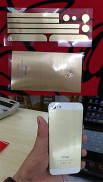 金色 iPhone 5S 上市后,市面上出现“一机难求”的场面。网上很快出现一款价格 20 元左右的金色 iPhone 贴纸,可以将普通 iPhone 瞬间变成“土豪金”。