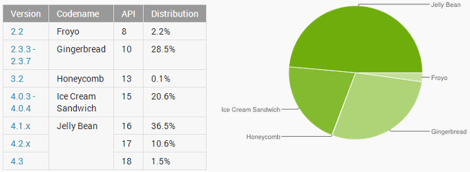 Google 公布的数据显示,截止至 10 月 2 日为止,已有 48.6% 已激活 Android 设备正运行其 “果冻豆”系统(Jelly Bean 4.1-4.3),而“姜饼”与“冰淇淋三明治”的使用率,则分别为 28.5% 和 20.6%。以上数据表明 Google 的移动系统版本碎片化问题正在得到改善。