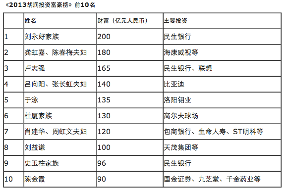 中国的“猪饲料大王”刘永好家族以 200 亿元的投资财富问鼎“胡润投资富豪榜”首富。“黑马”龚虹嘉、陈春梅夫妇以 180 亿元投资财富排名第二。 1996 年,刘永好与其他几位国内知名民营企业家作为主要股东联合投资兴办了民生银行,目前刘永好家族是民生银行第一大股东,持股比例为 6.7%。刘永好其他投资的还有深圳燃气、科伦药业等。
