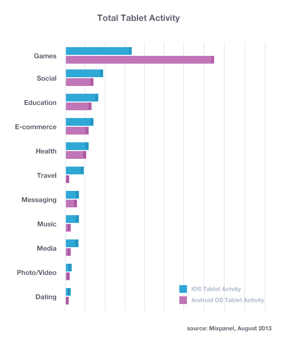 根据美国市场研究公司 Mixpanel 的统计,44% 的平板电脑使用量来自游戏,位居其后的四个大类(社交、教育、电商和媒体)的合并份额只有 27%。剩余 29% 的则被旅行、企业、音乐、信息、摄影和医疗瓜分。