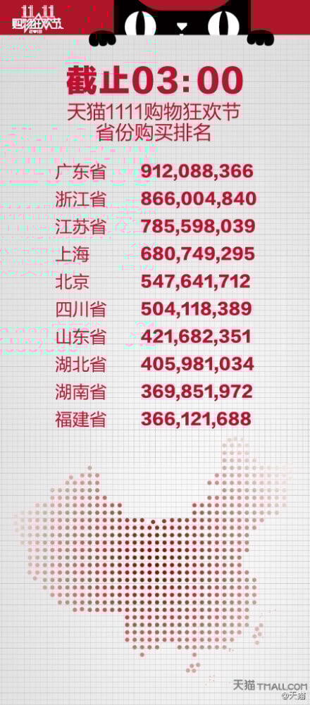 天猫公布了双 11 购物狂欢节全国省份购买力 Top 10(截止今天凌晨 3 点),其中广东省以 912088366 元排名榜首,浙江省 866004840 元紧跟其后,江苏省 785598039 元排名第三 第四到第十名分别为上海、北京、四川、山东、湖北、湖南、福建。河南省排名第十一。