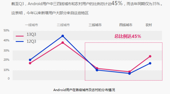 百度今天发布 2013 年第三季度《移动互联网发展趋势报告》。 报告显示,国内 Android 日活跃用户已达到 2.7 亿,用户每天平均使用时长突破 150 分钟。第三季度新增的 3700 万 Android 用户中,农村和城市打工族比例将近六成,三、四线城市和农村用户已占据整体 Android 用户的 45%。