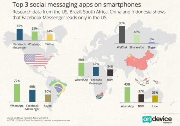调查发现,在全球范围内,WhatsApp 已成为最有影响力的移动聊天工具,在南非、巴西和印尼排名第一,在美国仅次于 Facebook-Messenger。从全球用户覆盖面上,WhatsApp 超过了 Facebook-Messenger。 44% 的受访者表示每周至少用一次 WhatsApp,Facebook-Messenger 这一比例为 35%,中国的微信排名第三,28% 受访者表示每周至少用一次。
