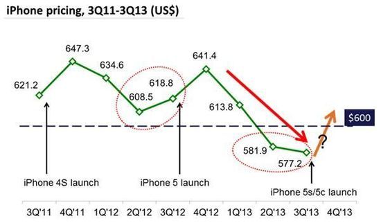 Digitimes 研究发布报告,苹果2013 年第三季度共售出 3380 万部 iPhone,包括 5S、5C 和其他老款 iPhone,比去年同期增长 25.7%。 iPhone 5c 销售已经远远落后于 iPhone 5s,因为 5c 性价比不高,定价模糊。这迫使苹果在新兴市场推销老款 iPhone,与其他低端产品进行竞争。其结果是,iPhone 手机的平均售价在第三季度下降到 577.2 美元的历史低点。