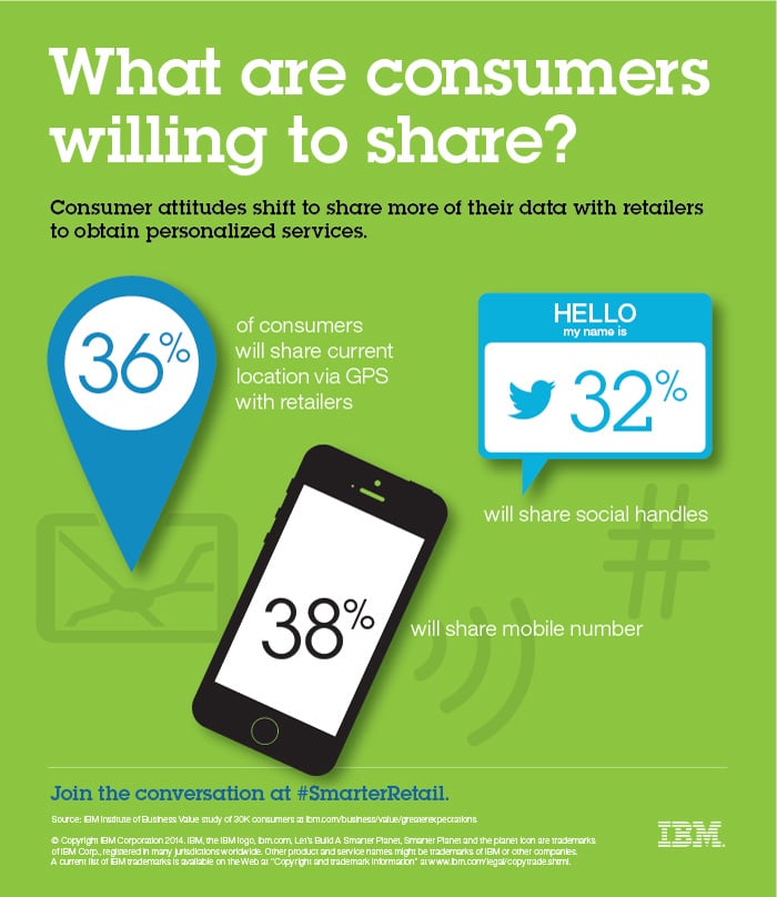 IBM 对全球超过 30,000 个消费者进行的最新调研结果于近日在 2014 全美零售联合会大会上发布,指出消费者愿意与零售商分享他们的个人信息,尤其是当他们能够获得良好的价值回报时。 愿意通过 GPS 与零售商分享当前位置的消费者比例比上年增加一倍,达到 36%。38% 的消费者愿意提供手机号码而接收文本消息,32% 的消费者则愿意与零售商分享他们的社交信息。