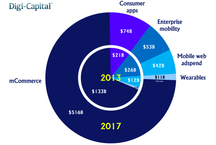 根据 Digi-Capital 的研究报告,未来 4 年移动互联网收入增长将超过 300%,到 2017 年达到 7 千亿美元的规模。 大部分的收入将来自移动电商部分,Digi-Capital 估计其规模将达到 5160 亿美元。