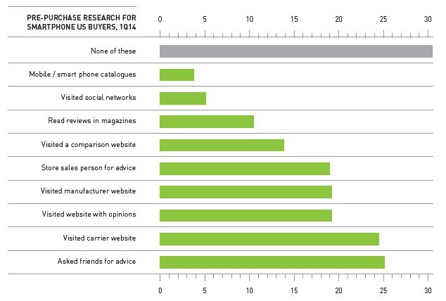 越来越多的美国消费者熟知“智能手机”的概念,在购买前仍然会做充分调查。 2014 年第一季度,70% 的消费者表示会在购买智能手机之前进行调查研究。1/5 的消费者在购买前和销售助理沟通过,1/5 的消费者接受来自朋友的建议。