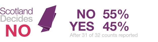 苏格兰独立公投计票结果 19 日公布,55.8%、共 1877252 名选民对独立说“不”。