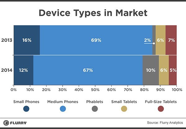 根据市场研究公司 Flurry 公布的最新数据,大屏手机,或者说巨屏手机的流行度正在快速增长。 在调查的 6 万部活跃设备当中,有 6% 都是巨屏手机,而这个数字在 1 年前才刚过 3%。而在应用会话中,来自大屏手机的占到了 11%。