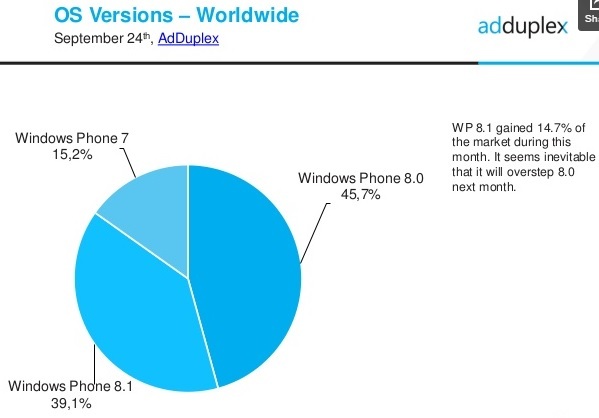 AdDuplex 发布 9 月份的 Windows Phone 市场统计数据。最新版的 Windows Phone 8.1 已占据近 40% 的市场份额。 Lumia 系列仍然是 Windows Phone 设备中的“霸主”。Lumia 630 和 Lumia 635 合计占据了 13% 的市场份额。