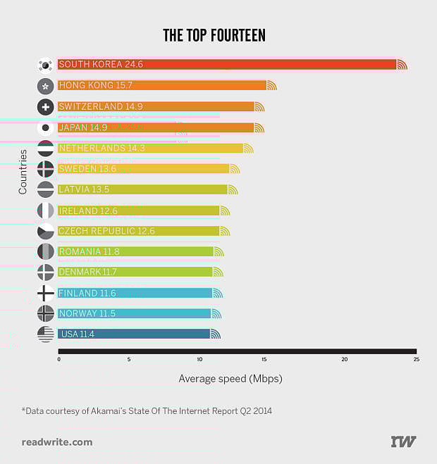 韩国平均宽带速度达到 24.6Mbps,排行第一,是美国的两倍多。