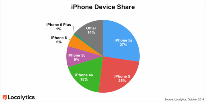 Localytics 数据显示,iPhone 6 系列新机的市场份额是去年 iPhone 5s 同期的 2 倍。 iPhone 6 目前在 iPhone 的市场份额达到了 6%,而 iPhone 6 Plus 是 1%。iPhone 5s 去年同期的市场份额则只有 3%。