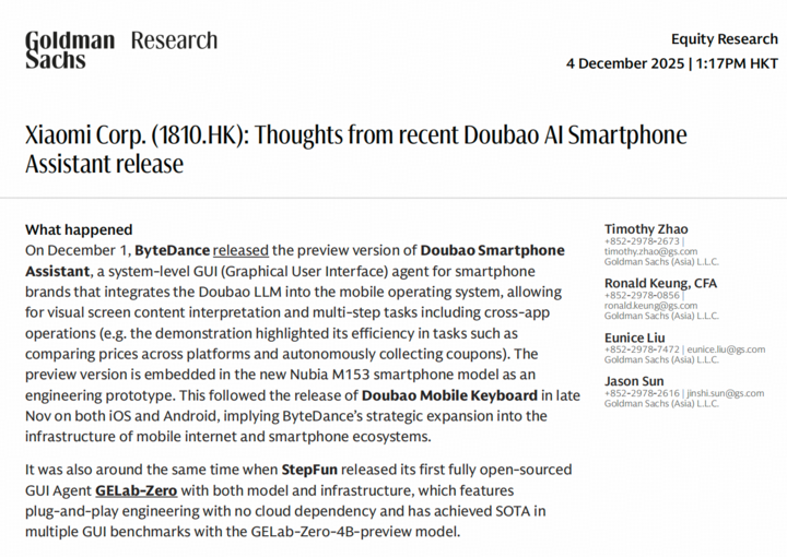 高盛认为,刚刚发布的豆包手机助手通过与智能手机OEC厂商合作实现了系统级整合,结合近期豆包发布的输入法产品,体现了字节向移动互联网基础设施和智能手机生态系统扩张的意图。