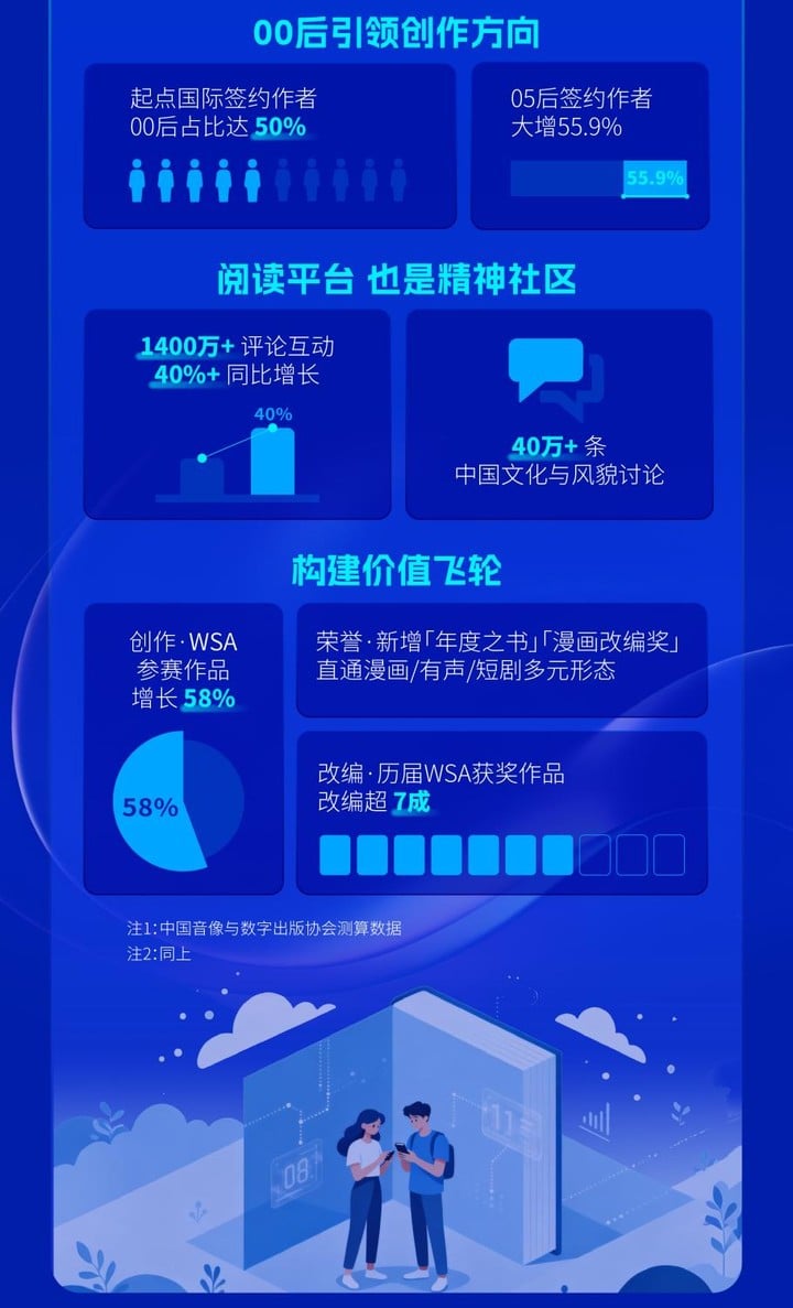 在内容生态方面,截至2024年底,中国网络文学作品累计规模已达约4210万部,创作基础持续夯实。海外原创生态同样蓬勃,截至2025年10月31日,WebNovel(起点国际)全球累计访问用户已近4亿,培育孵化了来自全球的近53万名作家、超82万部原创作品,作品总量同比增长20%,其中阅读量突破千万级的爆款已达538部。
