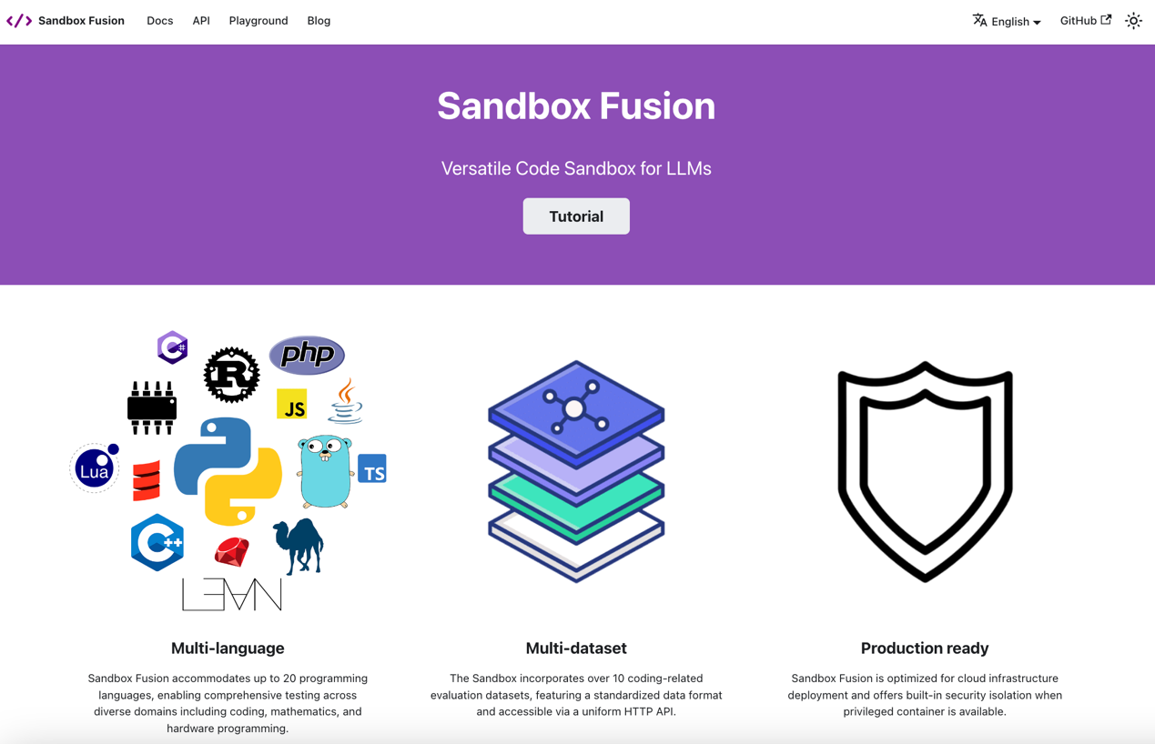 为方便开发者对大模型代码能力进行系统性测试,豆包大模型团队还开源了一款高效的代码沙盒执行工具——SandboxFusion,用于评估来自不同语言的不同编程任务。除了FullStack Bench,SandboxFusion还兼容超过10种广泛使用的代码评估数据集,支持23种编程语言。开发者在单服务器上即可轻松部署SandboxFusion,也可直接在GitHub上进行体验。