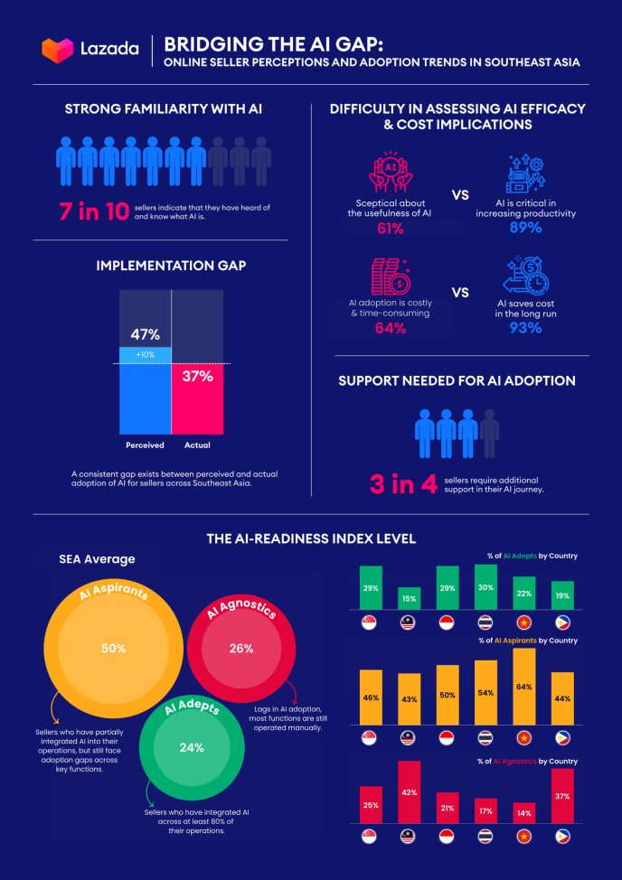 阿里在 AI 的应用上又抢先一步,而这次是东南亚电商平台 Lazada。据国际权威调研机构凯度 Kantar 日前发布的一份东南亚电商 AI报告显示,整体东南亚商家的 AI 工具应用率不足37%,但 Lazada 商家的应用率远高于此,报告指出,67% 的 Lazada 商家认为 AI 工具显著刺激了生意增长,目前 Lazada 已经成东南亚电商 AI 领军人。