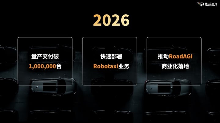 2026年,元戎启行将继续聚焦量产车辅助驾驶、Robotaxi、RoadAGI三大核心业务。其中,量产车辅助驾驶业务将继续扩大合作车型与客户体系,力争实现累计交付突破一百万辆;Robotaxi业务将加速推动商业化落地,打造真正具备商业复制能力的Robotaxi体系;在RoadAGI业务方面,元戎启行将持续推动商业化落地进程,赋能移动智能体在末端配送等关键场景的实际应用。