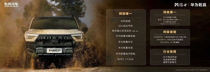 猛士M817 Hero版的到来,与在售的猛士M817 Pro版、Max版、Max+版组成更全面的智能越野产品矩阵,让猛士汽车“智野家族”实力再升级。猛士M817 Hero版以全域通达的硬核实力,让每一次远征底气十足;以华为乾崑赋能的智能科技,让每一段旅程安心从容;更以全能拓展的改装潜力,让每一个梦想的改装方案都能照进现实。