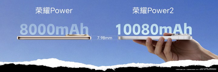 新一代荣耀Power2搭载行业最大10080mAh第四代青海湖电池,相比上一代增加高达2080mAh,续航表现再度突破行业极限,并在TÜV莱茵实验室的标准综合场景续航测试中斩获最长续航手机的佳绩。同时,通过将电池硅含量提升至15%,实现行业领先的926Wh/L能量密度,荣耀Power2将机身厚度精准控制在7.98mm,做到了让续航体验跨越式升级的同时,依然保持和上一代相同的超薄机身。
