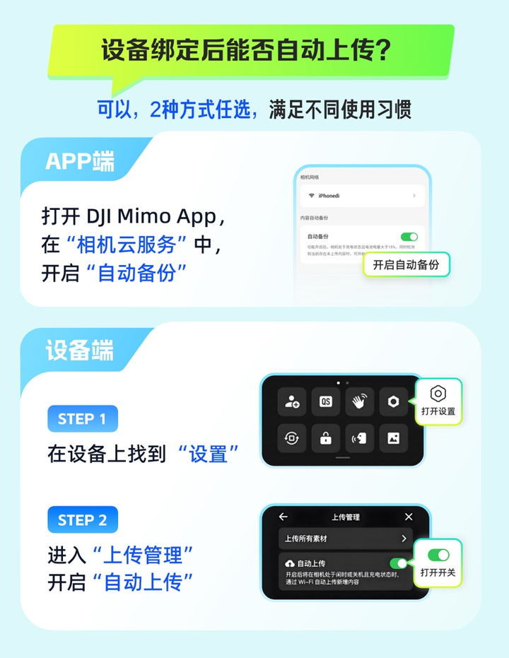 如需自动上传影像文件,用户可在 DJI Mimo APP 端开启「内容自动备份」,或在相机设备端的「设置-上传管理」中开启「自动上传」。照片备份成功后,可下载夸克 APP,在夸克网盘文件中查看来自 DJI 的影像文件。