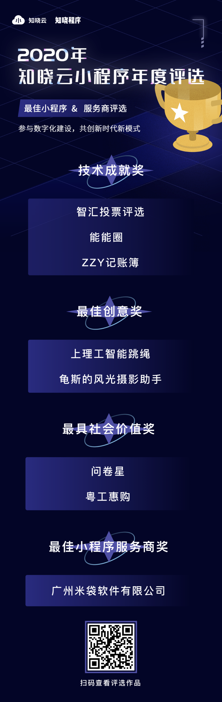 在「2020 知晓云小程序评选」活动中,我们推出四个奖项:「技术成就奖、最佳创意奖、最具社会价值奖、最佳小程序服务商奖」,通过初轮评选和大众投票后,最终获奖的小程序和服务商如下: