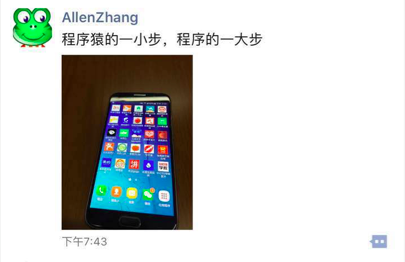 这张图里是一部 Android 手机,桌面上放着有以 MiniAPP 结尾的应用图标(第三行第三个),而 MiniAPP 正是「小程序」的代号之一。张小龙的朋友圈写着:「程序猿的一小步,程序的一大步」。
