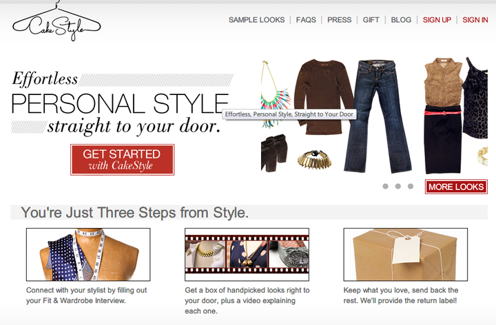 CakeStyle 网站是专门针对女性的服装购物网站,它从设计师那里购买时装,之后只要用户在 CakeStyle 上注册账号,填写自己大致的服装偏好(尺码,风格、品牌等),然后留下自己的邮寄地址。之后 CakeStyle 的造型师亲自将通过电子邮件和电话,甚至是视频通话与用户进行沟通协调,详细了解用户喜欢的款式,并为不同季节组合不同的服饰搭配提供专业的个人建议。之后用户就可以在家里等着一大堆相应款式的衣服自己上门了。