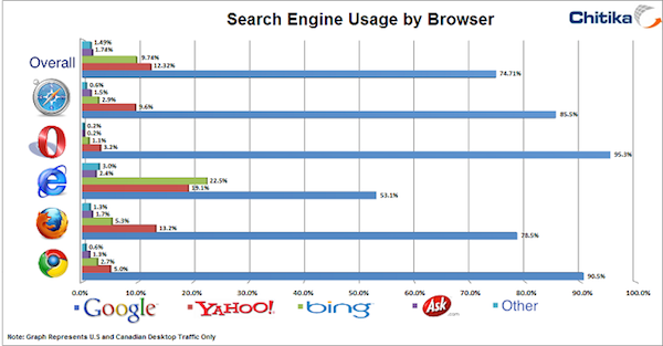网络广告公司 Chitika 的研究部门 Chitika Insights 近日对各搜索引擎占有的市场份额做了一个调查。Chitika Insights 截取了从 8 月 14 日到 8 月 20 日不同时点的数百万次广告曝光,统计出 Google、Yahoo、Bing、Ask 四家主流搜索引擎在 Google Chrome、Firefox、IE、Opera、Safari 五种主流浏览器中的市场占有率。由于统计数据来源于 Chitika 自己的广告系统,这份报告具备相当的可信度。不过也因为 Chitika 业务覆盖的地域有限,这份报告只能反映世界范围内大部分地域的真实情况(统计结果和我们国内情况会存在一定的不同)。Chitika 作此调查的主要目的是了解浏览器是否会影响用户对搜索引擎的选择。