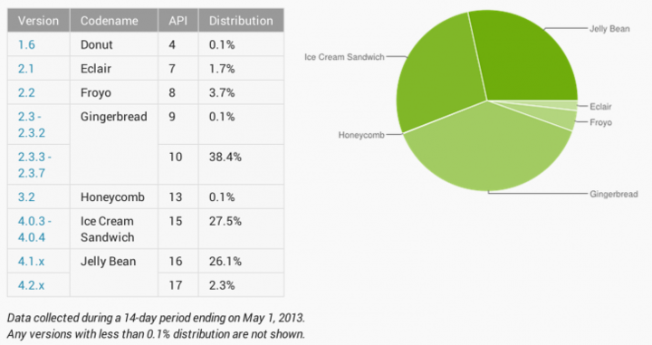 发布已经两年半的 Gingerbread 自上个月统计跌破 40% 之后,此次则继续下跌至 38.5%。不过仍然是各版本中份额最多的。
