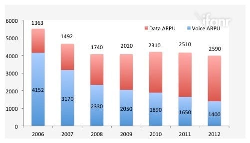 我在两年的报道中诟病活动没有邀请到日本运营商 Softbank Mobile(软银移动),后者在流量经营方面很成功,是典型顺应了“流量时代”潮流的运营商。翻看 2006 年至今的年报,软银移动整体 ARPU 值是逐年下降的(下图),原因是语音业务的跌幅大于数据业务的增幅,但也正是得益于数据业务的增长,软银才避免了更大的跌势。截止 3 月底底的财报显示,软银移动与日本第一大运营商 NTT Docomo 的差距在不断缩小,而且它刚刚完成了对美国第三大运营商 Sprint 的鲸吞,一举成为全球第三大运营商。
