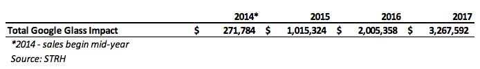 Google Glass 在 2017 年可能为到来 Google 32.7 亿美元的广告收入。分析师 Robert Peck 在报告中对投资者这样分析,Google Glass 四年后的装机量可能是 6 万 4500 台,新机售价可能是 349 美元,但不管销量如何,硬件本身的收入仍然非常有限。