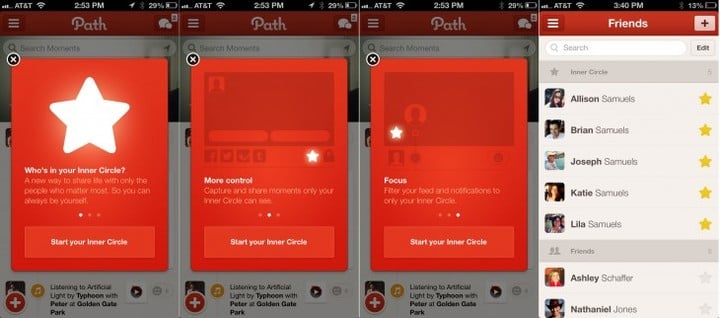 Path 还加入了私密分享功能,点击输入框右侧的锁形按钮,即可选择向特定用户分享信息。新增的内部圈最高允许 150 人加入圈子,点击星形按钮就能向圈内分享内容,来自内部圈子的朋友评论都会被打上星形标记。