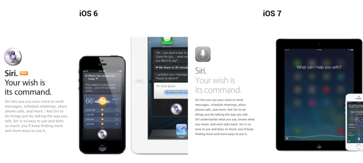 iOS 7 中,苹果重新设计了 Siri 的 UI 界面,改善语音质量,同时增加对维基百科等更多第三方信息的支持,早期的服务器报错和漫长的结果等待也彻底消失——Siri 可以摘掉“Beta 版帽子”了。