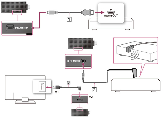BRAVIA Smart Stick 电视棒支持画中画播放,可以一边观看视频,一边浏览网页。相信这么干的人应该不多。即便如此,画中画也只能在通过 HDMI 连接卫星机顶盒的时候才能使用。BRAVIA Smart Stick 电视棒还能通过红外接口与 BRAVIA 电视机相连,连接过程参考说明书图示: