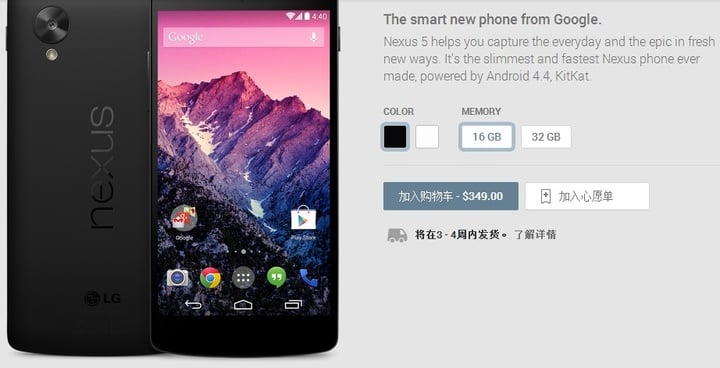黑色 16G Nexus 5 上线几分钟即告售罄,3-4 周后才能重新发货