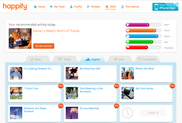 Leidner 称 25 年的研究结果显示,幸福人生的五大关键点是专注、感恩、热情、给予和同情。每个人在 Happify 网站上都会有这五个属性,通过参加活动你可以给各项属性加分。
